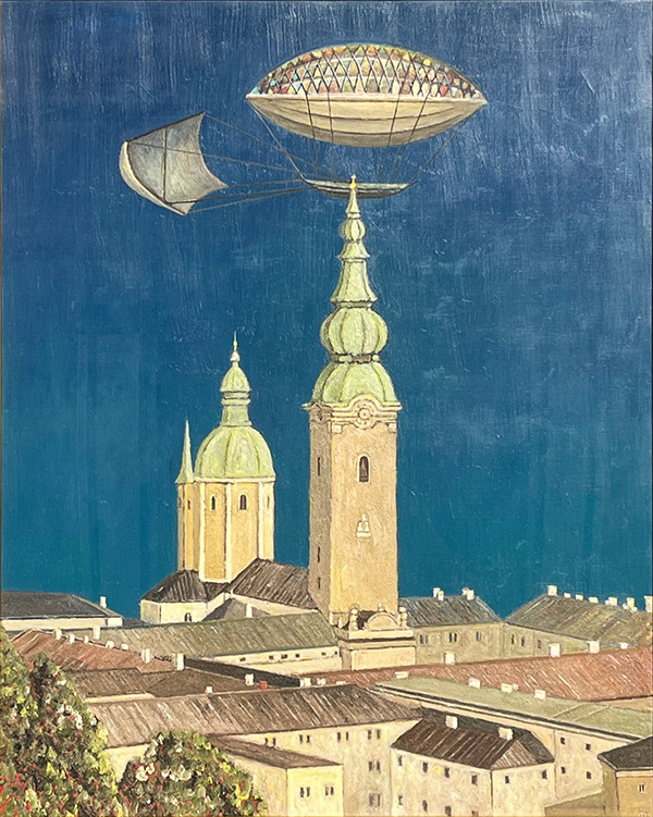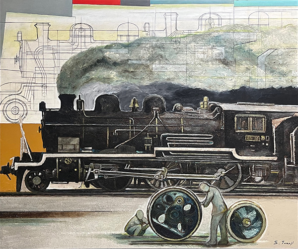 人の心に望郷の念があるようにノスタルジーを感じさせる蒸気機関車・飛行船、塔などを描いています。